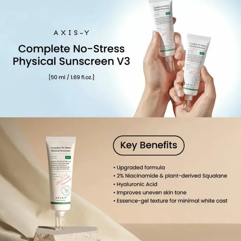 The Axis-Y Complete No Stress Physical Sunscreen is a mugwort-based mineral (physical) sunscreen that provides SPF 50+ PA++++ protection while actively calming inflammation and leaving a natural, “no-stress” finish.